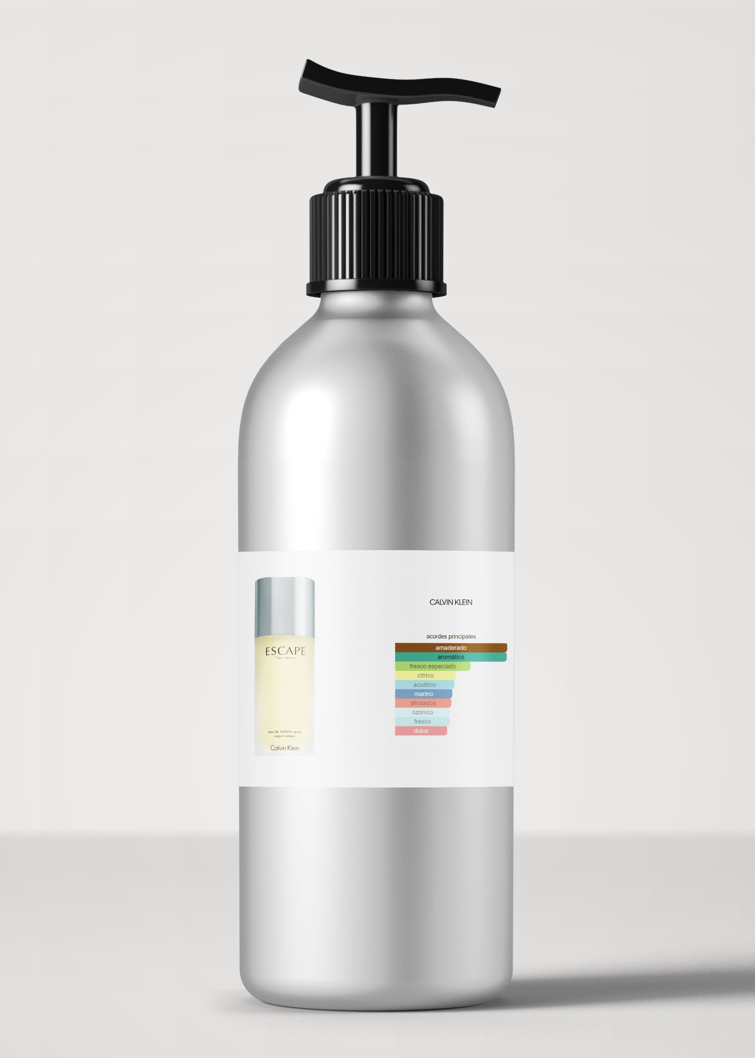 Escape for Men de Calvin Klein es una fragancia de la familia olfativa Aromática Verde para Hombres. Escape for Men se lanzó en 1993. La Nariz detrás de esta fragrancia es Steve DeMercado. Las Notas de Salida son melón, eucalipto, mango, toronja (pomelo), enebro de Virginia y bergamota; las Notas de Corazón son notas marinas, abedul, abeto, ciprés, romero y salvia; las Notas de Fondo son musgo de roble, vetiver, sándalo, ámbar y pachulí.